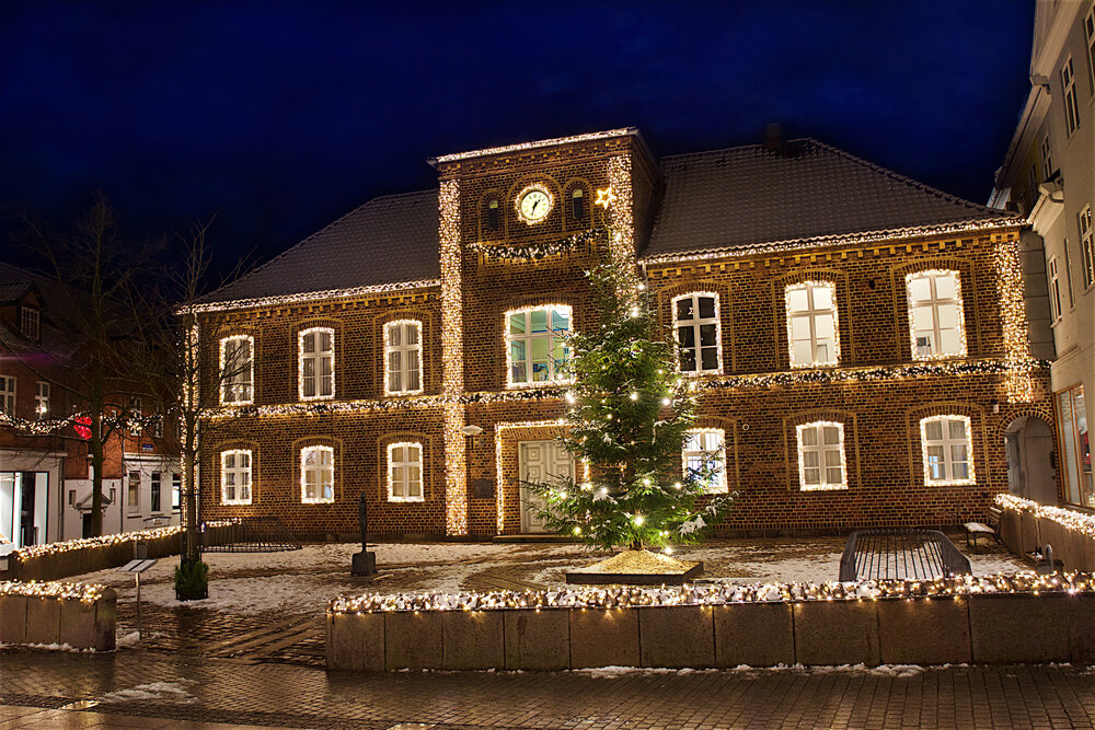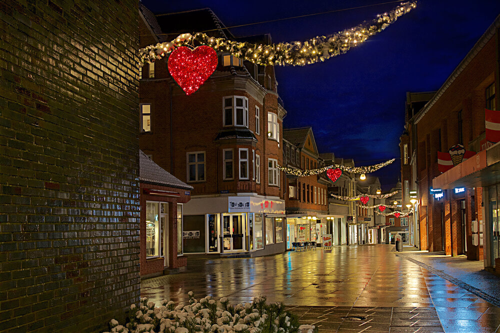 Holstebro valgte at samarbejde med os for at identificere de specielle kendetegn ved byen og valgte at musikteateret, byens kirke og rådhuset samt en masse statuer skulle belyses og pryde byen.