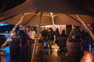Vi skaber stemningsfulde omgivelser med lys, photo points, lysende highlights og elegante salgsboder – alt kan lejes og tilpasses jeres behov.
