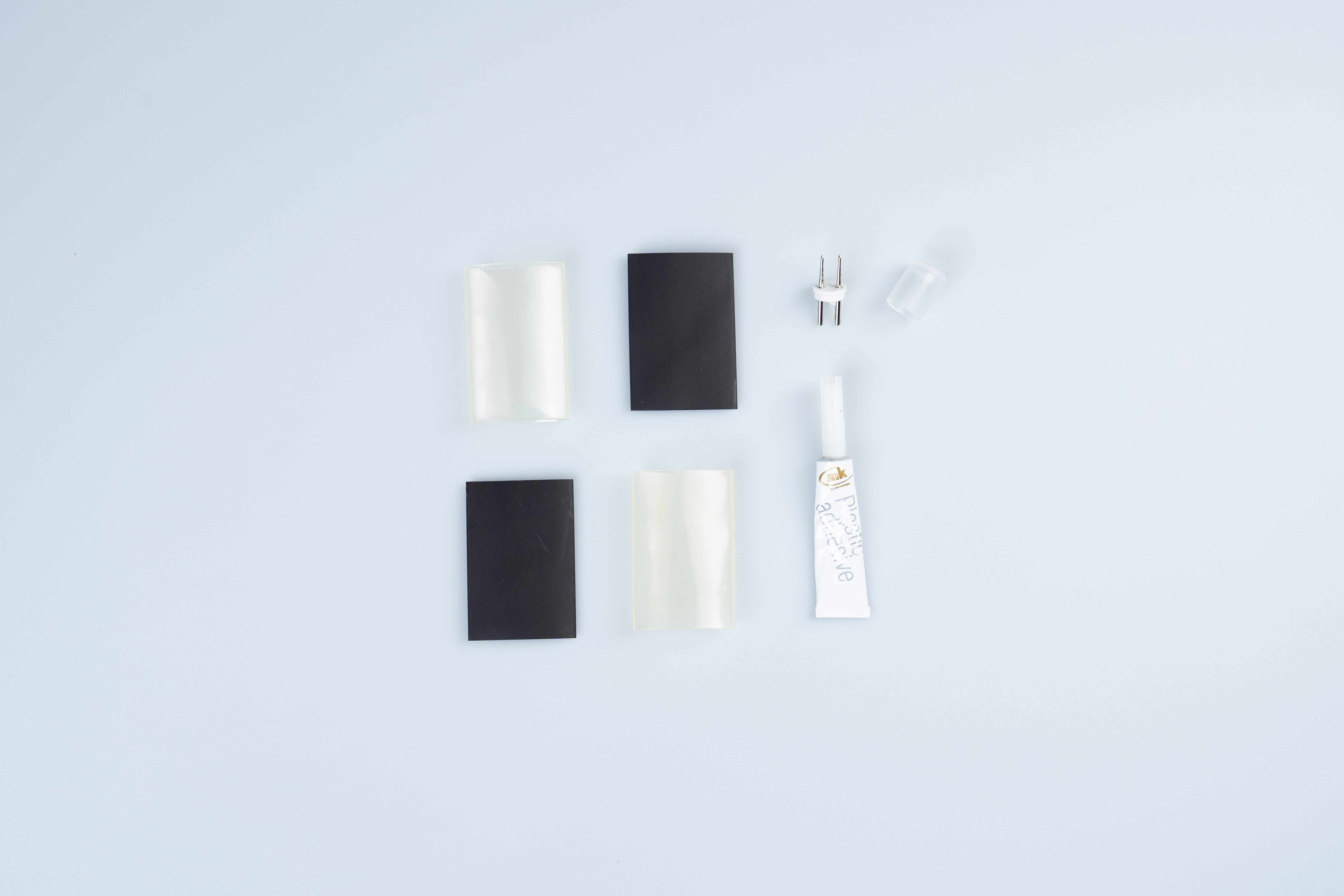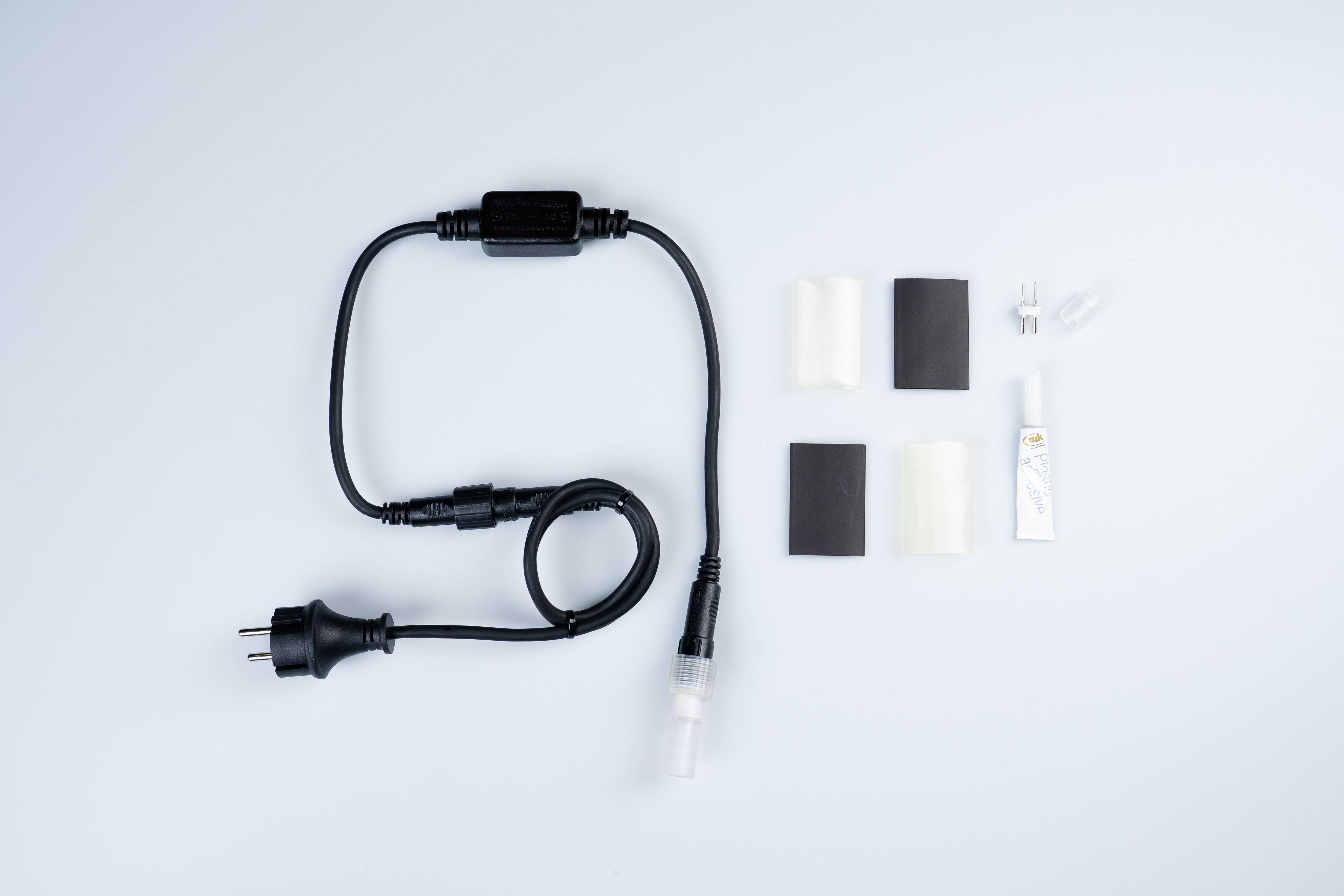 Das Anschluss-Set für LED Lichtschläuche enthält alles, was für eine einfache und sichere Installation benötigt wird: einen AC/DC-Wandler, eine Endkappe, Lösungsmittelkleber, einen Einspeisepin und 2 Schrumpfschläuche. Ideal für eine zuverlässige Verbindung und langlebige Nutzung Ihrer LED Lichtschläuche.
