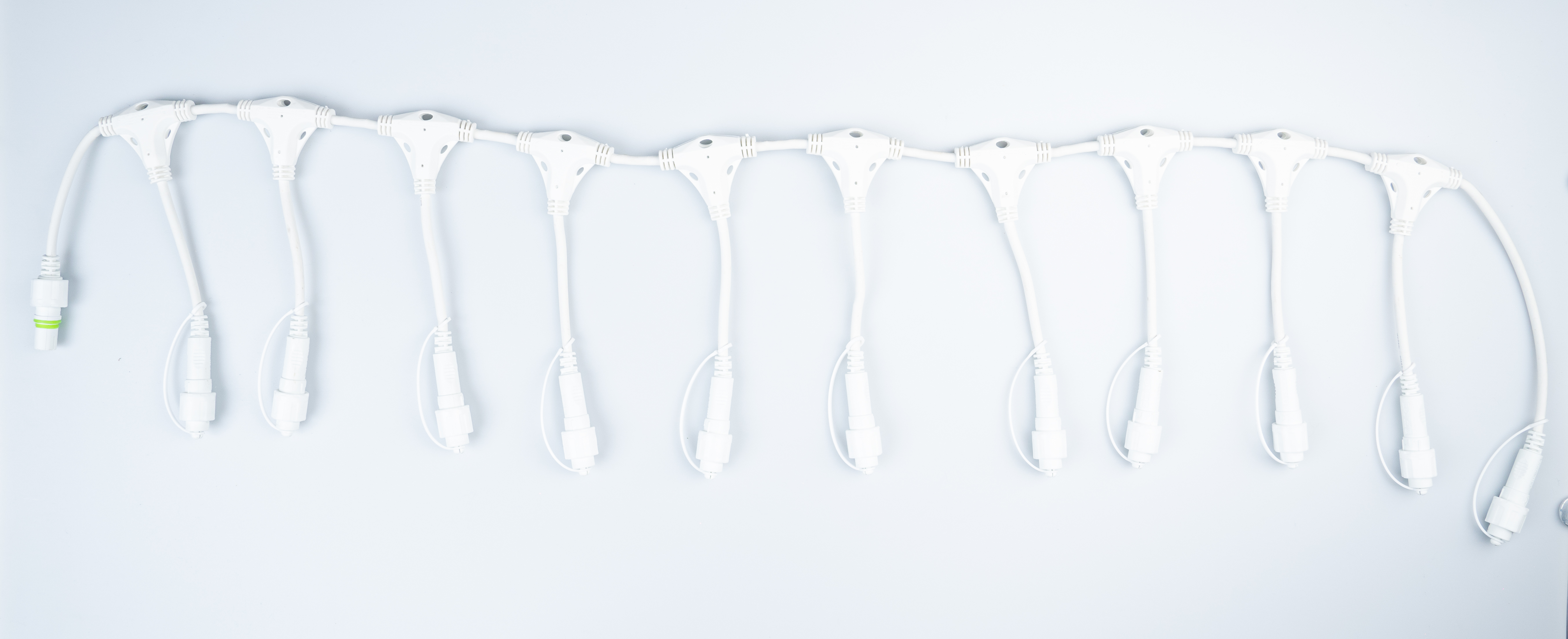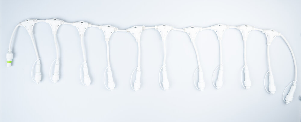Früher benötigte man für jedes Lichtelement eine eigene Steckdose, doch mit unserem patentierten QuickFix™-System gehört dies der Vergangenheit an. Dank dieses großzügigen Verbindungssystems mit 11 Ausgängen können viele Produkte unserer QuickFix-Familie, die entsprechend gekennzeichnet sind, problemlos miteinander verbunden werden – und das bis zu einer maximalen Belastbarkeit von 200 Watt. Jedes QuickFix™-Produkt wird einzeln qualitätsgeprüft und entspricht der Schutzart IP67, um ein sicheres Arbeiten im Handbereich zu gewährleisten. So lassen sich große, professionelle Dekorationen mit nur einer Steckdose realisieren und einfach verkabeln. Der Divider ist insgesamt 140 cm lang. Die einzelnen Ausgänge sind jeweils 10 cm voneinander entfernt und haben eine Länge von 20 cm.