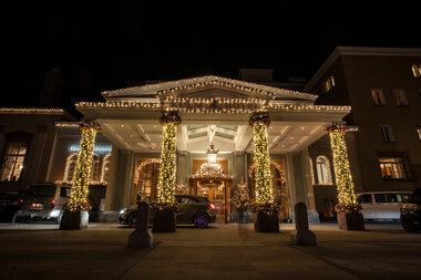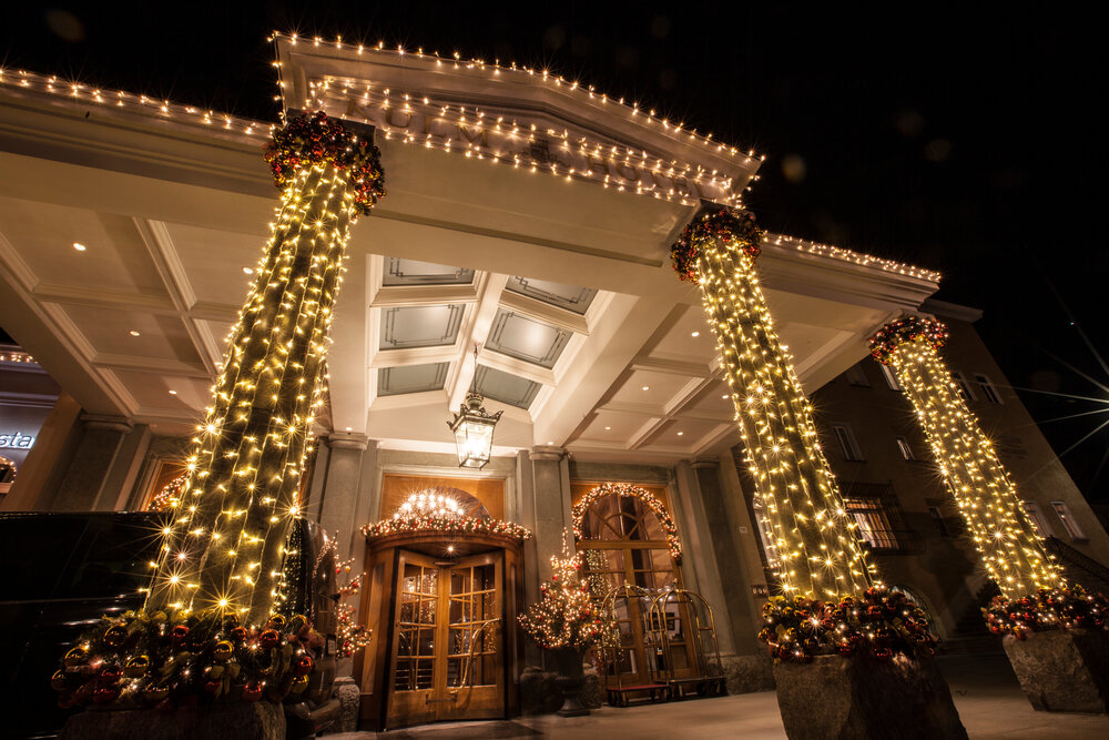 MK Illumination Schweiz verlieh dem Eingang des berühmten Kulm Hotels einen festlichen Weihnachtsglanz. Die Konturen des Hotels wurden mit strahlenden Lichterketten geschmückt und die Säulen mit warmweißen Lichterketten und Girlanden aus grünen, roten und goldenen Kugeln verziert wurden, um den ersten Eindruck zu vervollständigen. Das Ergebnis war eine elegante Weihnachtsdekoration, die den Besucher:innen einen herzlichen Empfang bereitete und sie in die festliche Stimmung des Kulm Hotels einlud.
