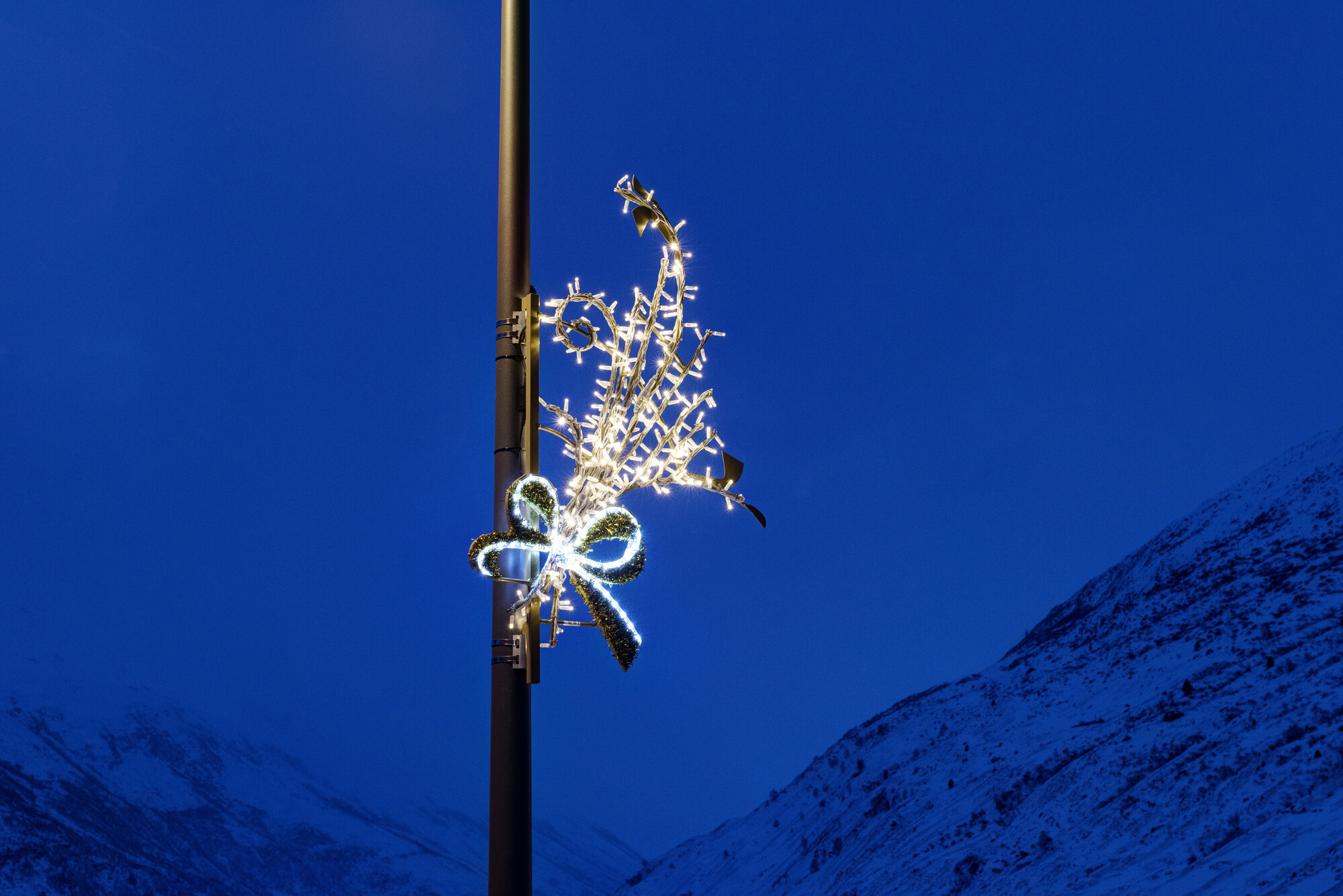 Straßenlaternen mit Mistelzweigen in Kombination mit goldenem Lichterschein sowie charmante Sternschnuppen schmückten die vielen Laternen im Ort. Auch der Aussenbereich des "The Chedi Andermatt", einem 5-Sterne-Luxushotel im traditionellen Dorfkern, wurde festlich beleuchtet. So verwandeln sich in der Weihnachtszeit die Bäume auf dessen Vorplatz in funkelnde Weihnachtsbäume.