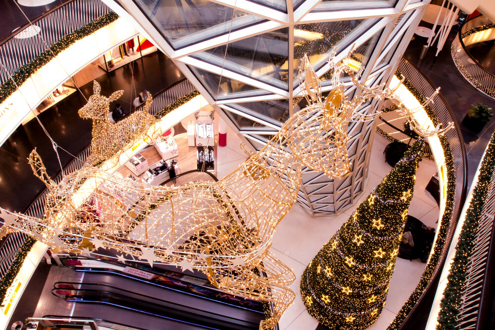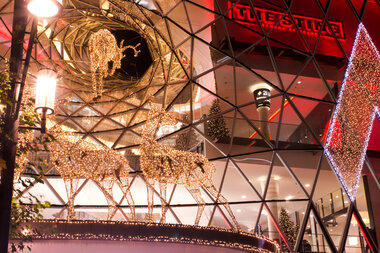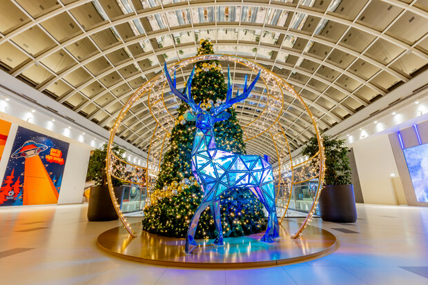 Schon beim Betreten der Mall beginnt das Abenteuer: majestätische Hirsche aus dem "Zauberwald" setzen zum Sprung durch den Eingangstrichter an und nehmen die Besucher:innen mit auf eine Reise voller Mystik und Zauber. Überdimensional große Hirsche fliegen in einer atemberaubenden Choreografie durch die Etagen, begleitet von einem silbernen Schweif aus funkelnden Sternen. Eine elf Meter hohe Weihnachtstanne dient als Wegweiser durch das märchenhafte Geschehen, bis hin zur majestätischen Begegnung mit einem überlebensgroßen Weihnachtshirsch im obersten Stockwerk.