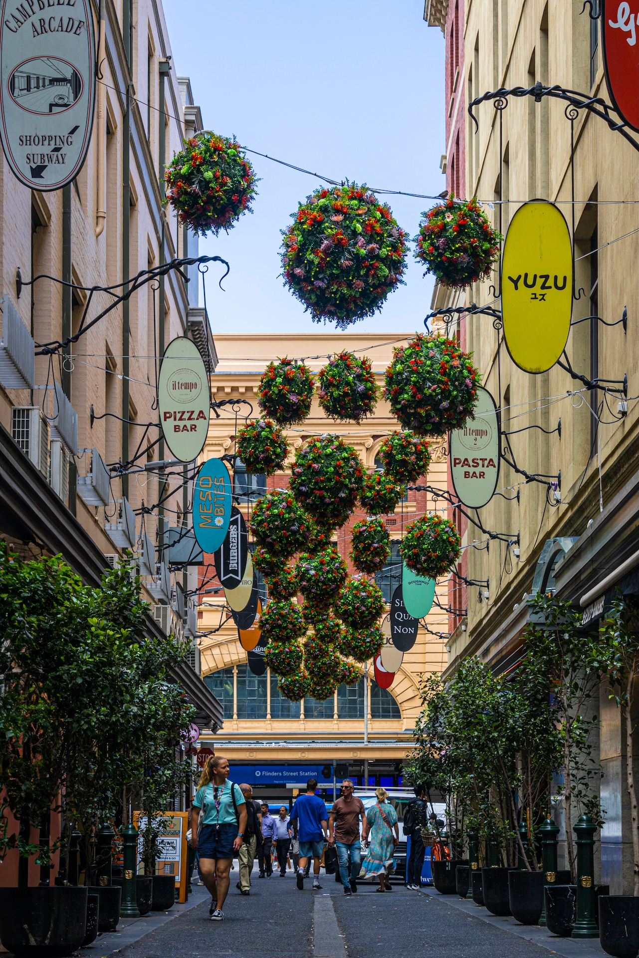 To enhance the cozy look and feel of the space, the canopy of the restaurants was surrounded with ice-light and the trees were wrapped with string lights and adorned with organic balls. This created a spectacular display that could be captured from any angle along the lane, providing visitors with a truly festive atmosphere.