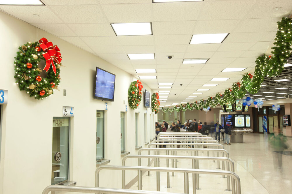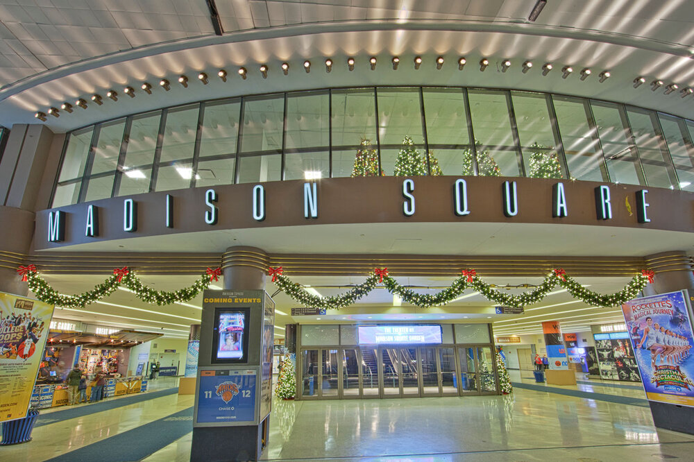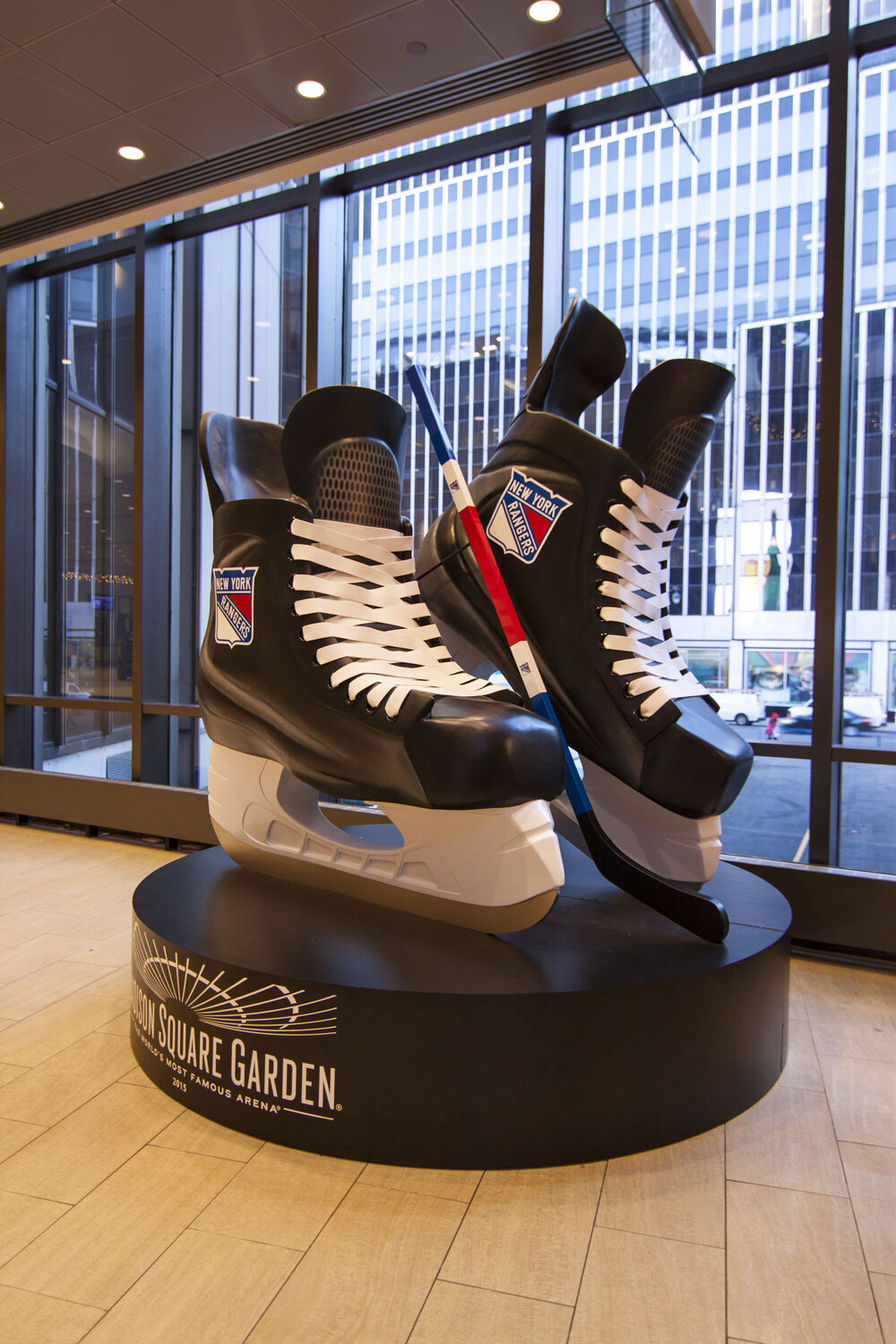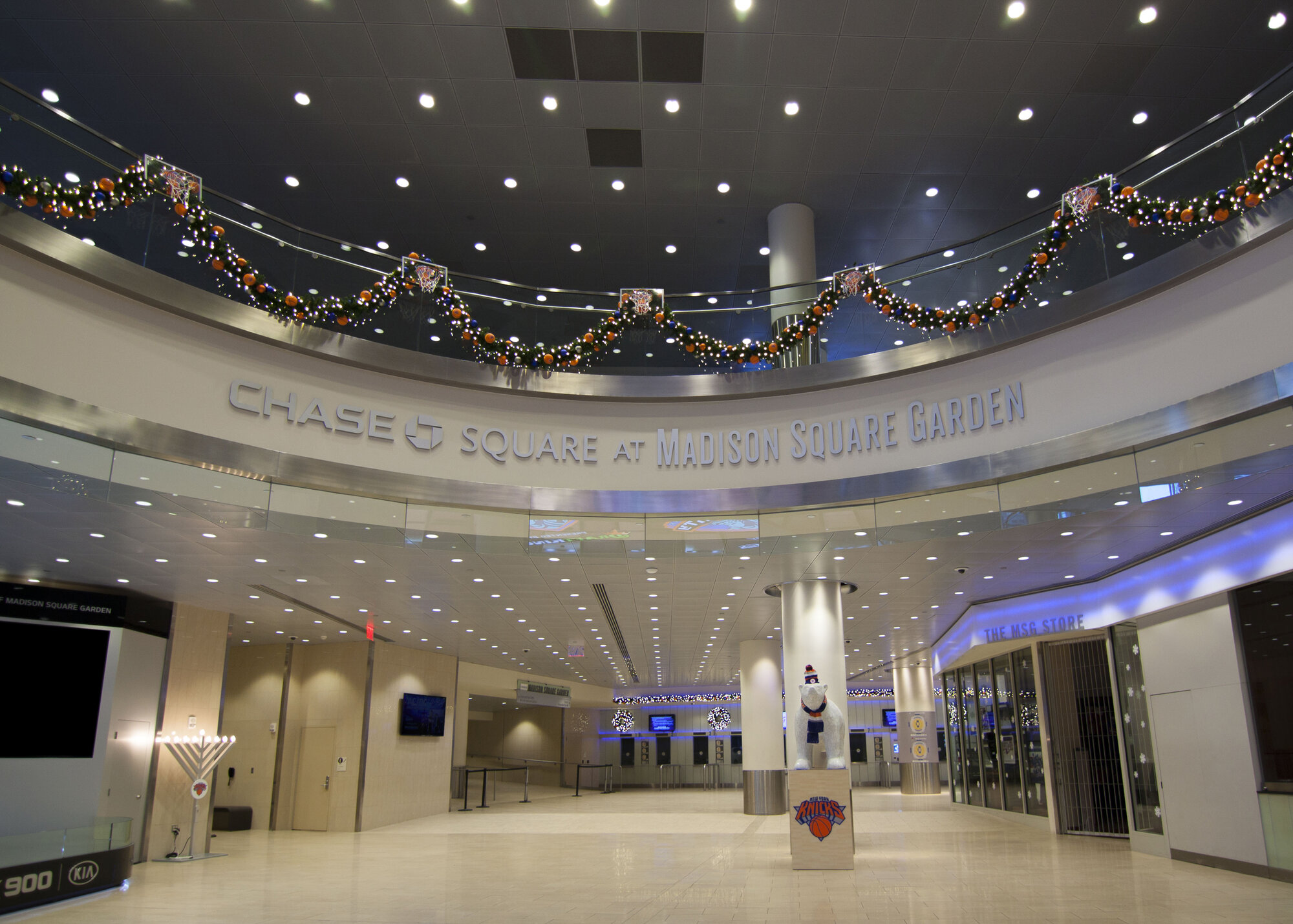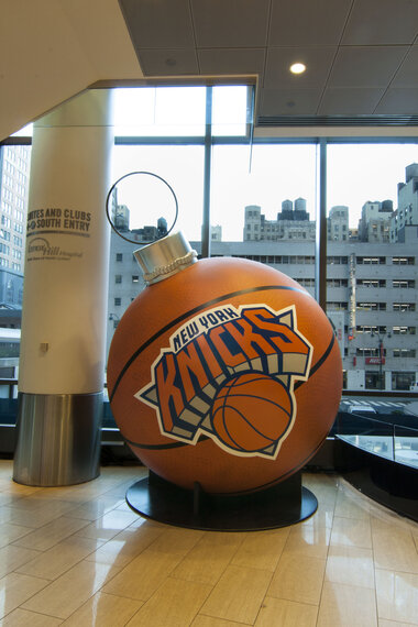 For this Project MK Illumination's American Christmas combined lights, greenery and custom festive motifs in the form of ice skates and an oversized basketball Christmas bauble to create the perfect festive atmosphere in Chase Square at Madison Square Garden.