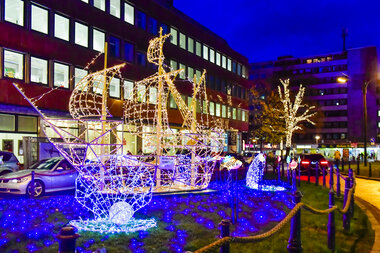 Under the motto "Pomp im Pott", the protagonists of Christmas City Dortmund have realised an innovative lighting concept for 2021. The large-scale installations take visitors on a journey through Dortmund's history. Along numerous decorative highlights, visitors embark on a magical journey through the new and old Dortmund with traditional stories, funny clichés, colourful art, modern light installations and interactions.
