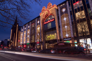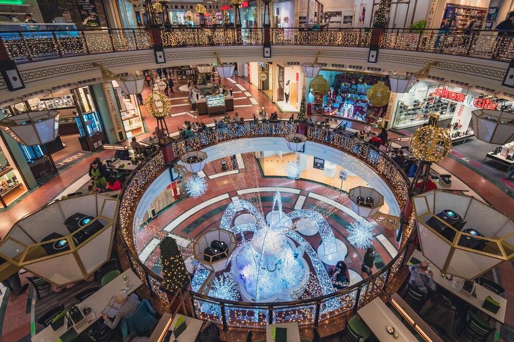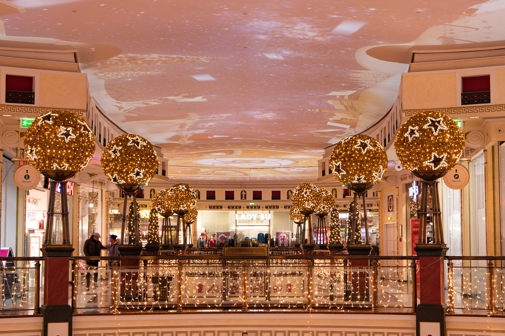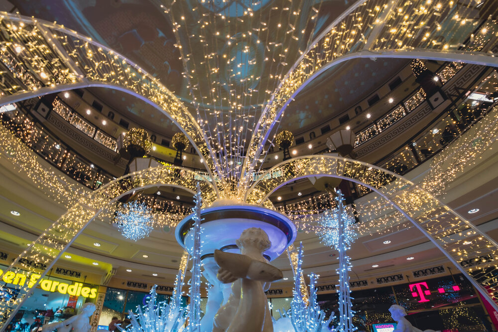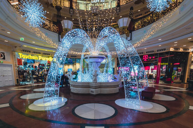 Following the American example, this feeling is supported by glittering light displays. A huge ribbon wraps around the façade of the centre. Warm white and brilliant white light curtains and 2D snowflake motifs add to the effect. Inside the mall, oversized star-shaped globes adorn the columns.