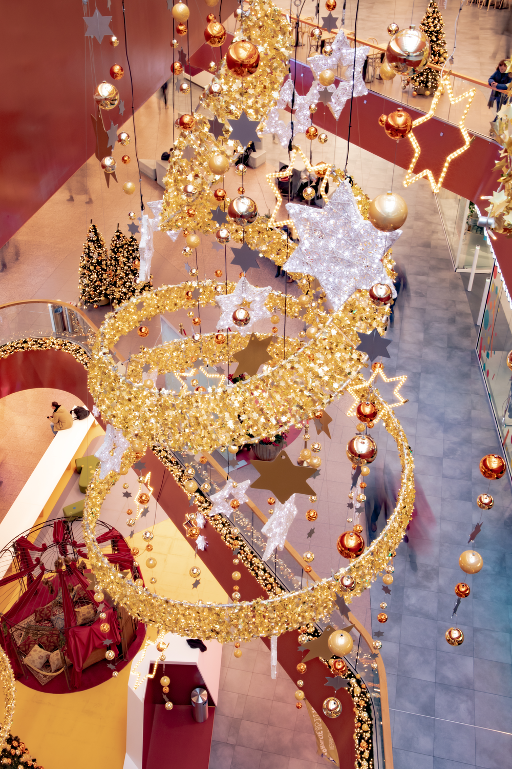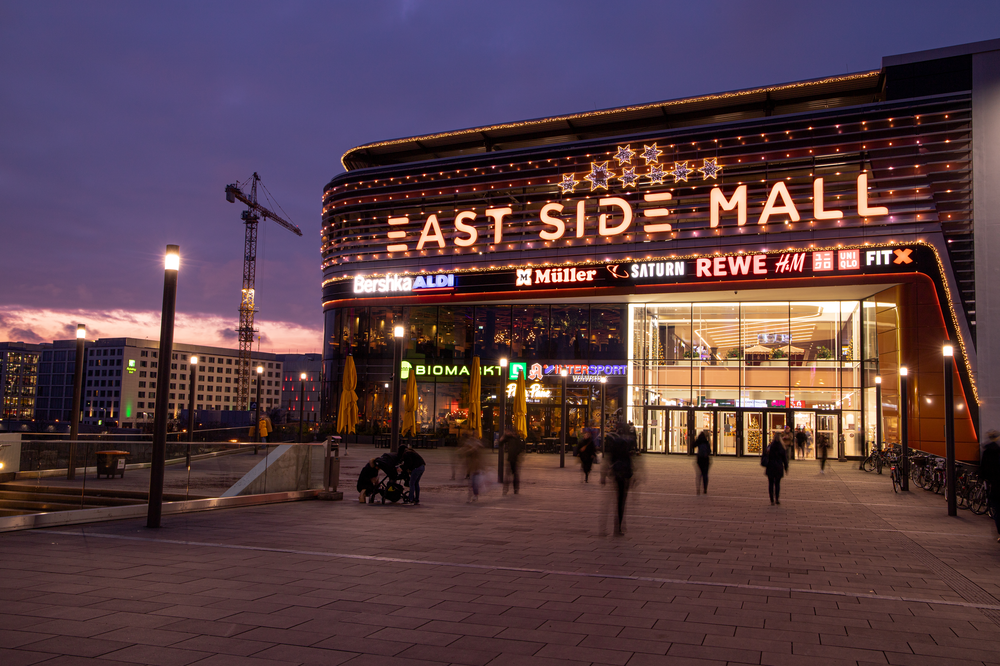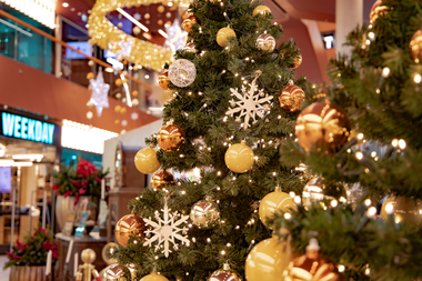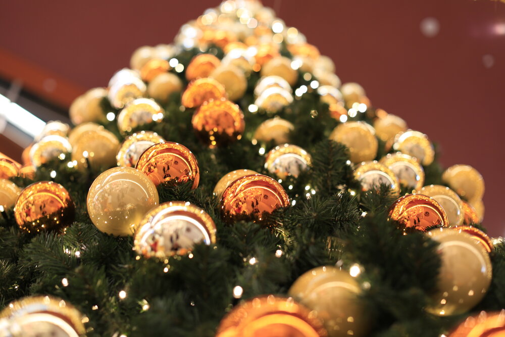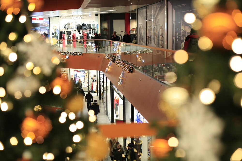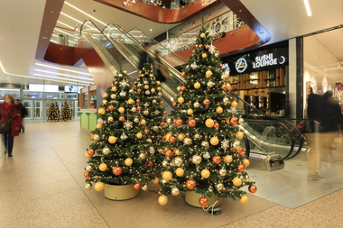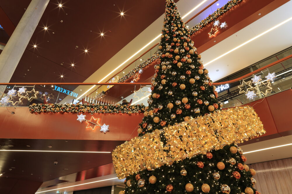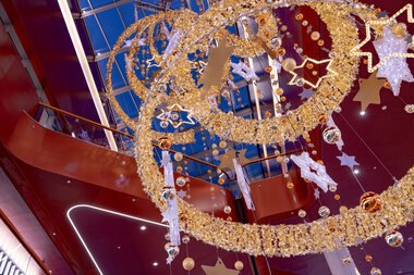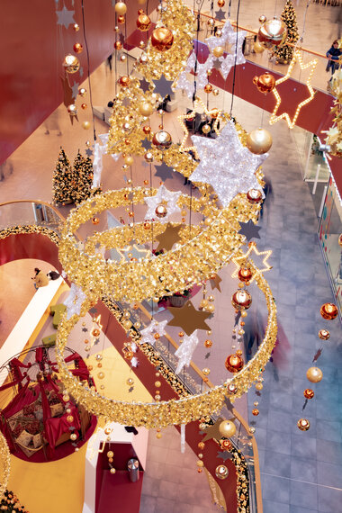 In 2018, we decorated the East Side Mall in Berlin with sparkling lights and green trees. The colour scheme blends in perfectly with the existing architecture. The gold and orange baubles on the trees and the warm white lights create a festive atmosphere throughout the mall.