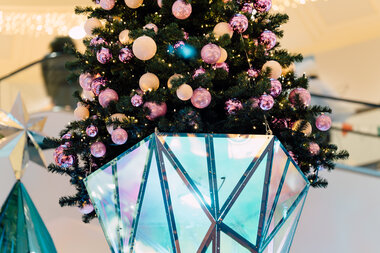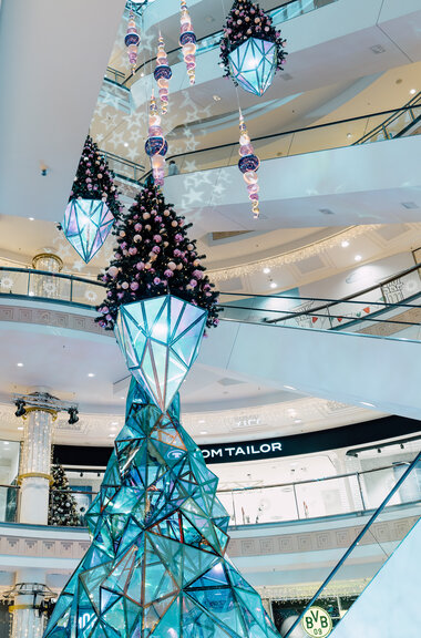 Under the theme of "Heart of the Ruhr Area" the Christmas lights brilliantly capture the essence of the design concept. Four monumental highlights await discovery, promising to envelop visitors in a world of enchanting wonder. A flying Christmas tree acting as a music box, creates a spell of festive cheer. Meanwhile, a rotating platform unveils the winter silhouette of Essen. The event area boasts a kaleidoscope tree adorned with reflective facets, radiating brilliance alongside flying Christmas trees and jewelry hangers.