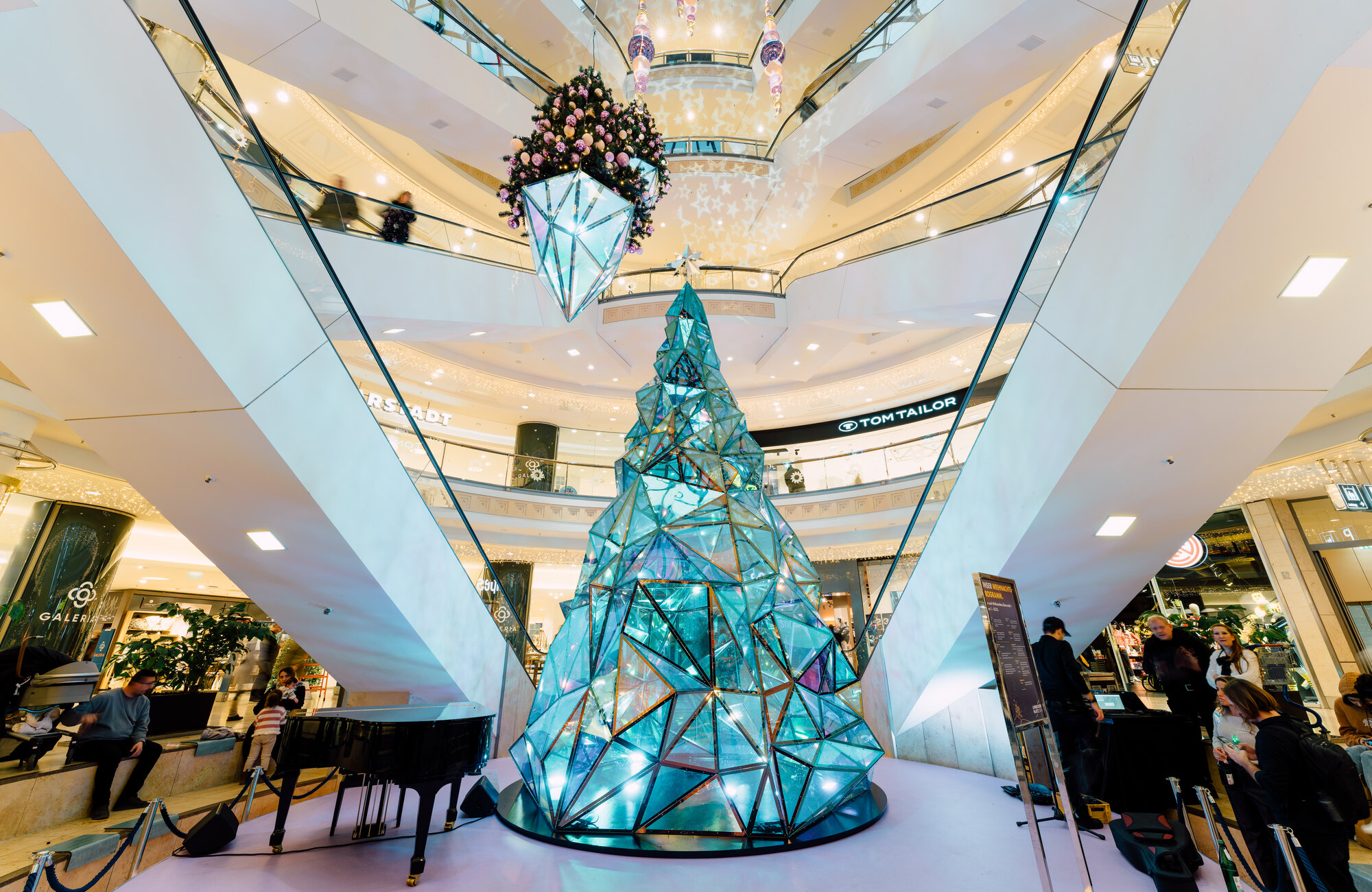 In another rotunda, a golden crystal chandelier takes on the form of a Christmas tree, releasing elegance. The grand finale showcases a heart crafted from charcoal, encircled by shimmering lights and luminous Christmas wreaths.