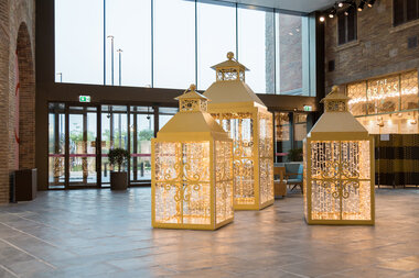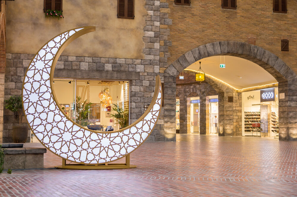 As visitors entered the Outlet Village during Ramadan, they were greeted by giant fanous (lanterns) twinkling with light. The lanterns were painted in gold to create a stunning effect day and night.