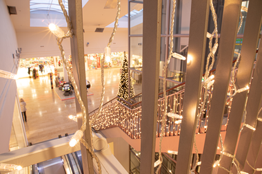 The green garlands guide visitors through the shopping centre. Christmas lights on the staircases also add to the festive atmosphere. The highlight is an oversized Christmas tree in the atrium.