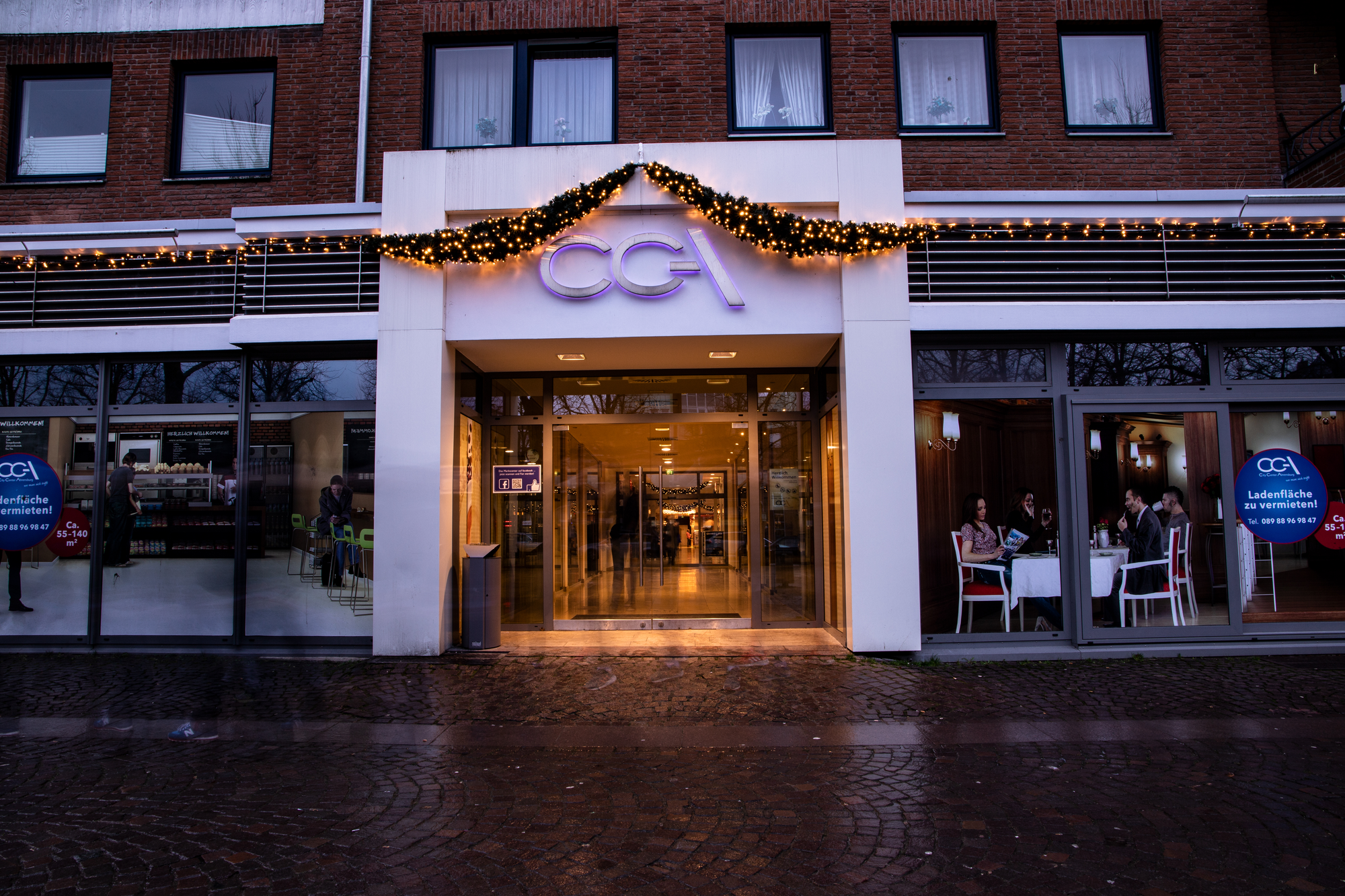 Lifelike green trees and green garlands, coordinated with warm white fairy lights and red and gold baubles, delight visitors to City Center Ahrensburg during the Christmas season.