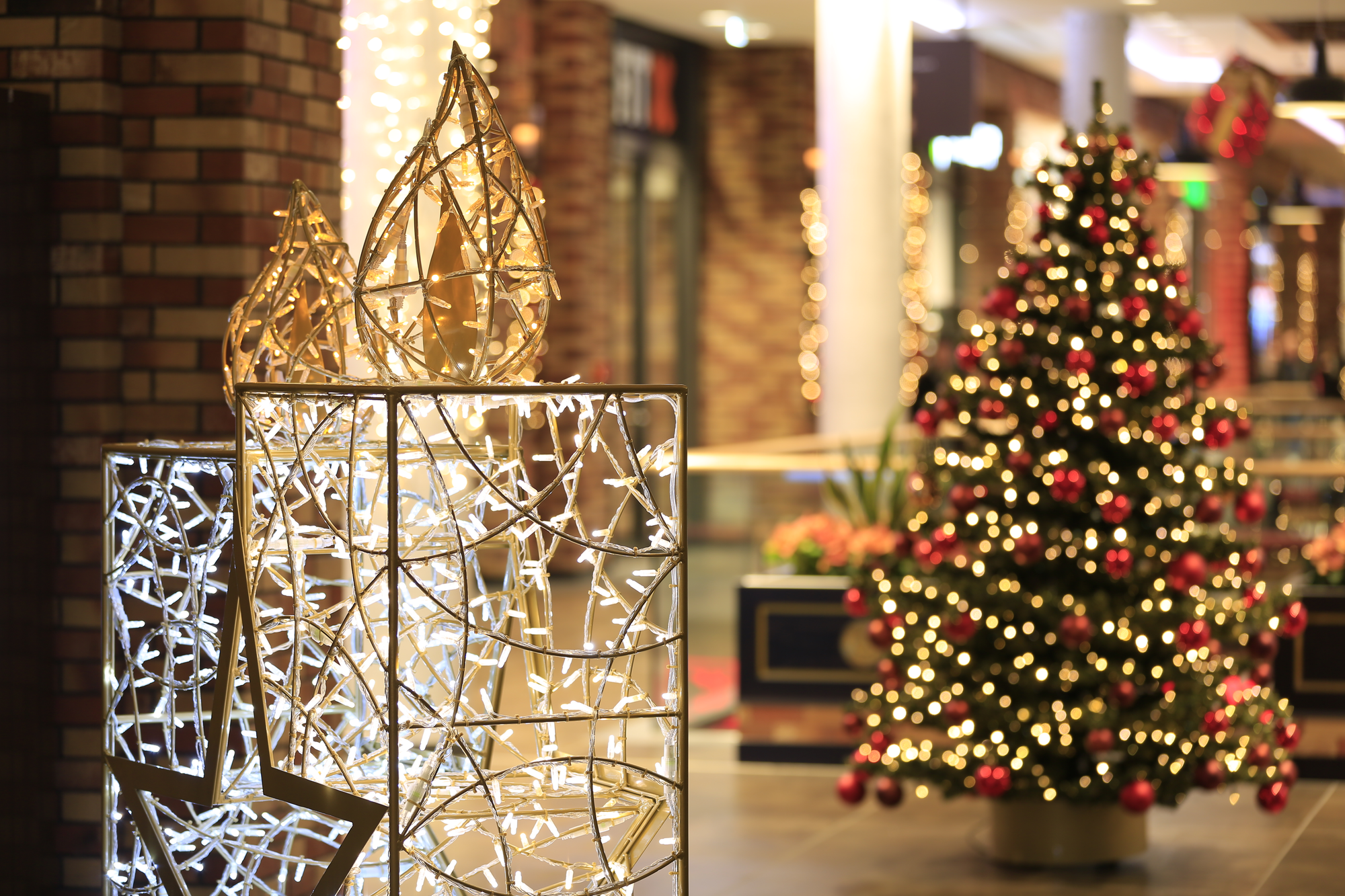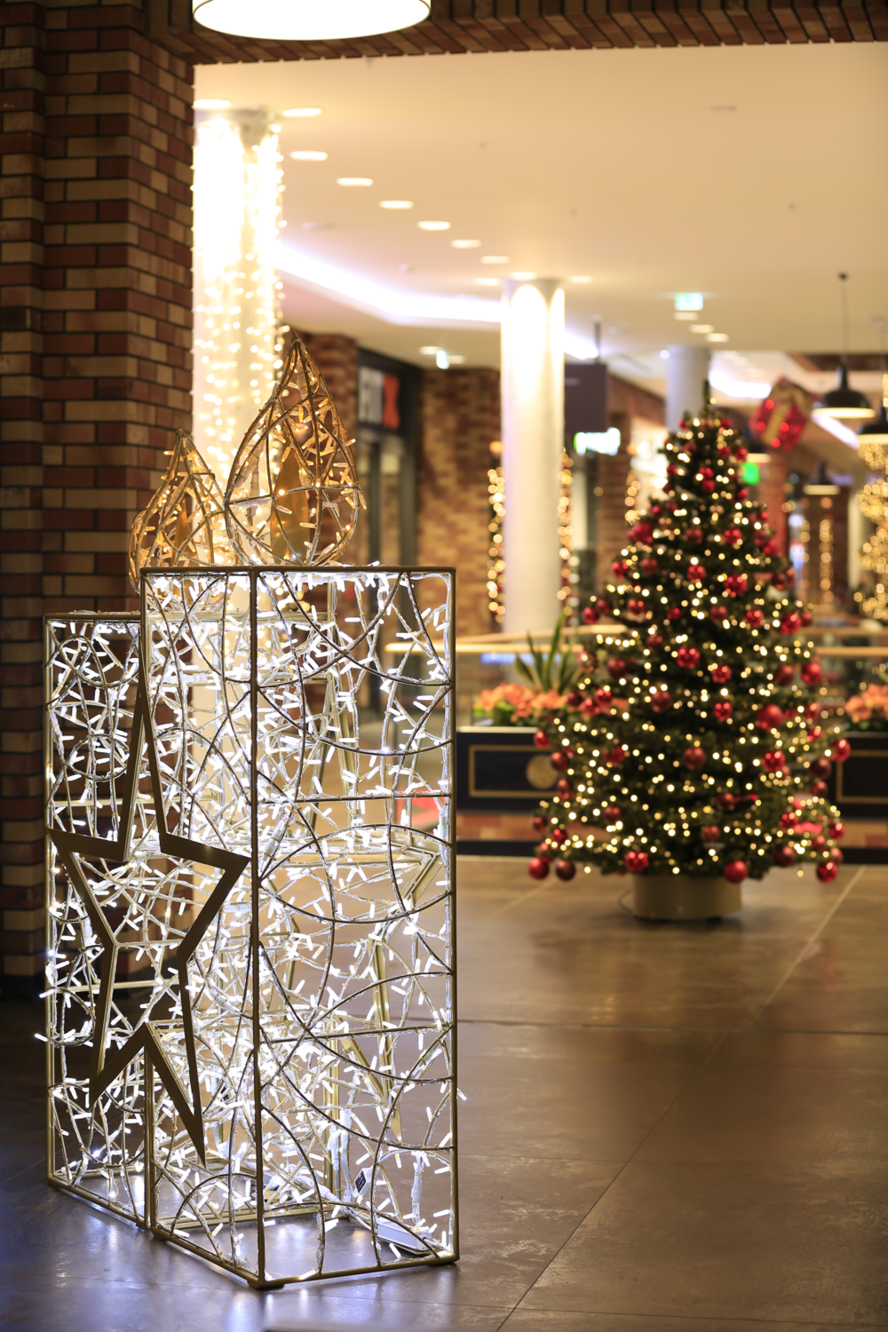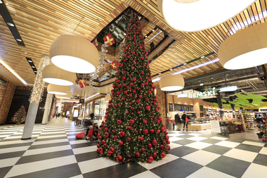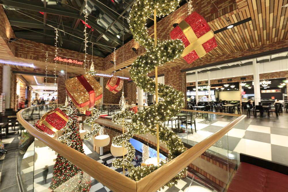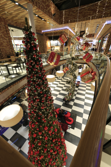 MK Illumination's Organic range of 3D gift-wrapped light designs complemented the rustic design elements of the mall, while the façade lighting welcomed pedestrians and motorists alike. The festive spirit continued outside in one of the centre's plazas. A giant Christmas tree, glittering in gold and red, added to the festive atmosphere.