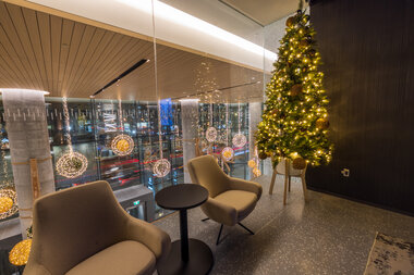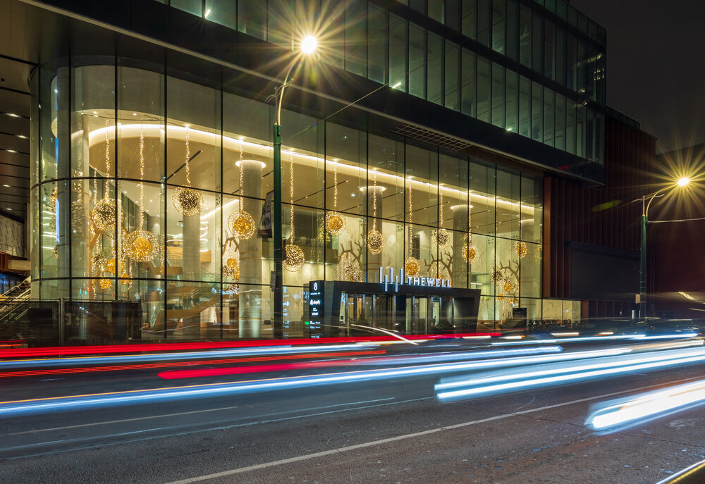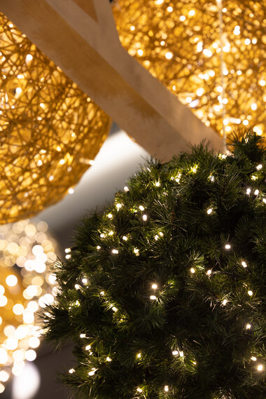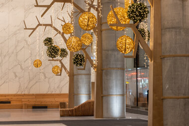 With its refined, natural style, this enchanting décor captures the vision and values of the prestigious Toronto complex and surrounds clientele in an inspiring atmosphere. The Well is an eco-responsible design featuring organic and sustainable materials such as wood. Custom-made tree sculptures by local artisans and suspended glittering balls, featured both inside and outside the premises, dazzle guests.