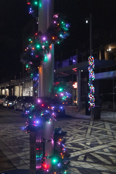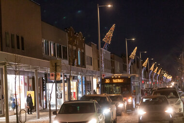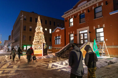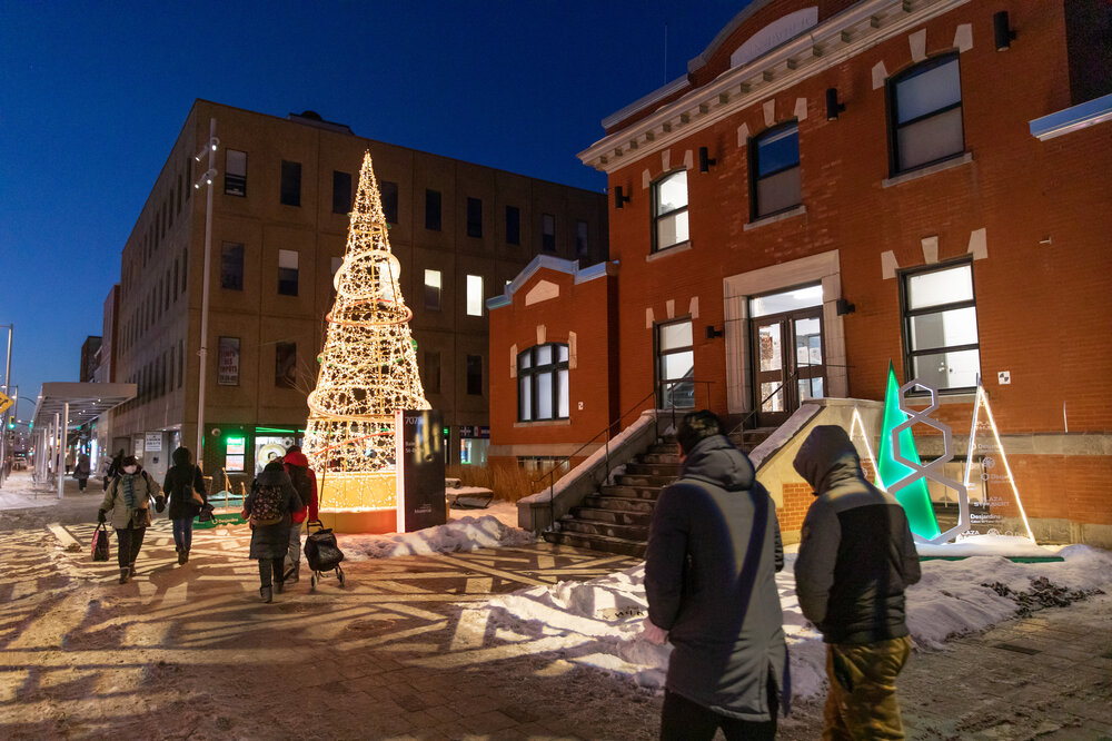 La Plaza St-Hubert est ornée de touches vibrantes, telles que les structures coniques des lampadaires, les guirlandes lumineuses qui les entourent, et l’imposant cône de la Place publique.