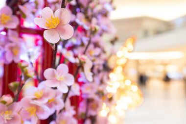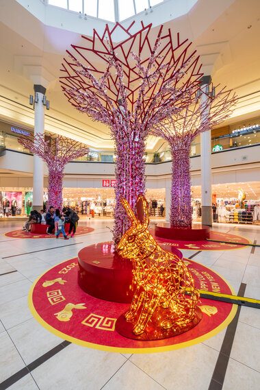 Les troncs métalliques des Supertrees, conçus par MK Illumination, étaient ornés de lumières blanches et de fleurs de pêcher. Nous avons également ajouté un revêtement de sol en vinyle personnalisé et des lapins de cinq pieds de haut avec des cadres rouges et des lumières dorées pour représenter le signe du zodiaque chinois de 2023, un symbole important qui peut facilement être remplacé chaque année pour correspondre au nouveau signe. L'effet global offrait une expérience immersive pour les locataires et les clients.