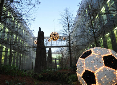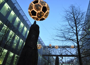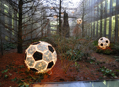 These footballs have been placed in the outdoor area of the striking FIFA headquarters in Zurich.