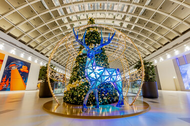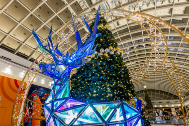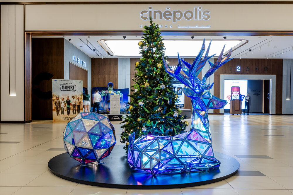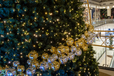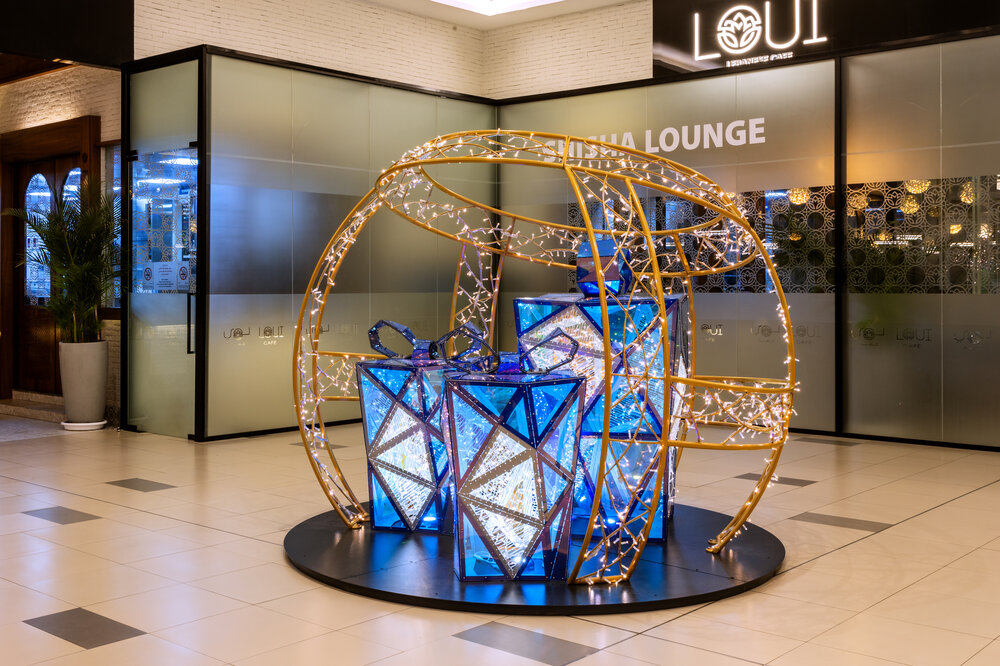 Christmas decorations from the future. A holographic element refracts the spectrum of light and the same spot of glitter reflects the entire colour spectrum. Depending on the angle of light, the decoration appears red, blue, green, purple or yellow. From this point of view, the holographic New Year concepts are reflective and glittering, representing a variety of colourful New Year's wishes. The multicultural visitors will flock around this unified concept with the beautiful iconic New Year designs of trees, presents, reindeer and bubbles.
