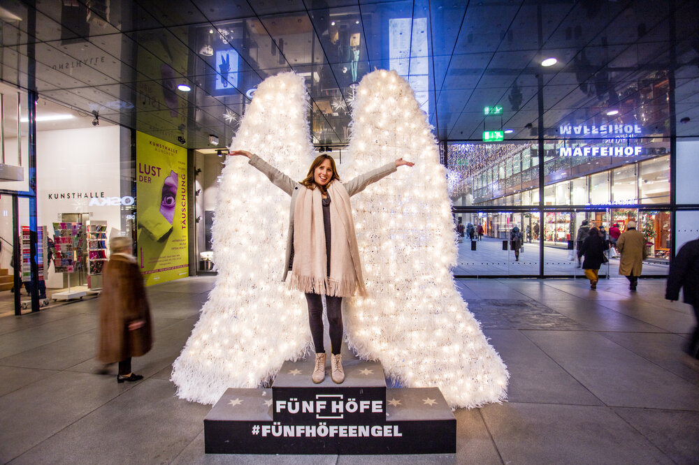 A highlight of the Christmas presentation was a specially created photo point where glittering angel wings awaited visitors. Visitors could stand on the branded platform and be transformed into an angel for a photo. Numerous photos were taken, which were increasingly shared and commented upon on social media, thus increasing the reach of the CityQuartier Fünf Höfe.