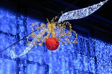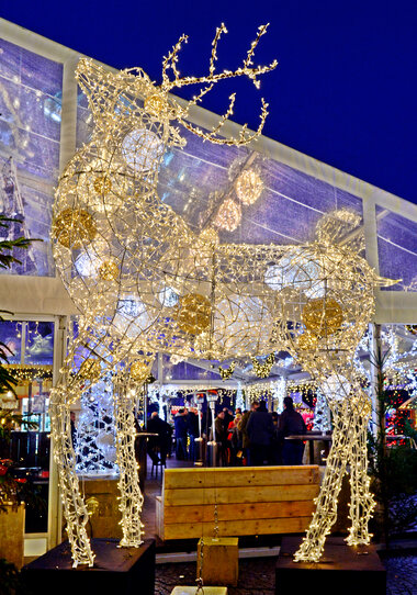 In early December, the festive lighting was extended further, and glorious Christmas trees and trees draped with lights appeared throughout the city and even on the ice rink! 3D light sculptures of stags and shoes were carefully placed in the city, hanging motifs illuminated streets with good wishes,