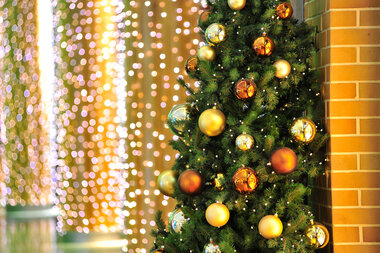 Selected supporting columns throughout the center were decorated with draping lights that fell in straight lines from top to bottom. On each level of the center, atrium balconies were decorated with golden baubles and twinkling lights embedded in greenery, as were the ceilings of walkways and the sides of each escalator. String lights adorned special architectural features in uneven cascades, bringing icicles to mind.
